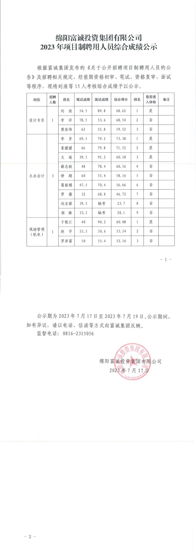 2023年项目制聘用人员综合成绩公示