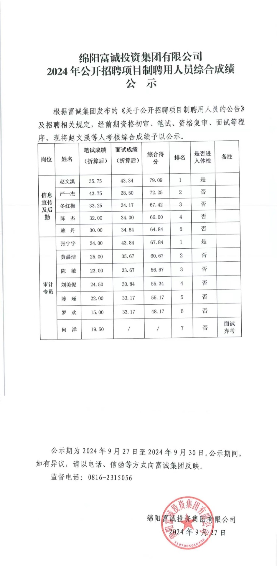 2024年公开招聘项目制聘用人员综合成绩公示