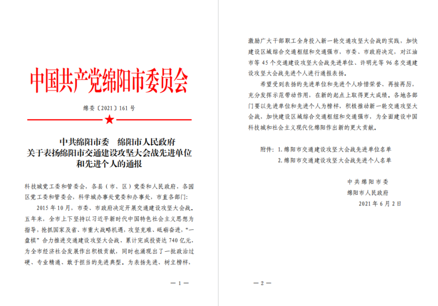 近日,中共绵阳市委、绵阳市人民政府通报表扬了绵阳市交通建设攻坚大会战先进单位和先进个人,PA真人集团官网党支部书记、董事长魏良浩同志荣获先进个人称号。2016年10月,为适应绵阳市南片区产业的发展需求,经涪城区区委、区政府报请省、市交通主管部门同意后,由PA真人集团官网集团负责绵中公路改建标准全面提升项目的实施打造。该项目的建成通车对绵阳打造市级区域综合交通枢纽以及积极创建省级交通强市具有重要作用。在建设过程中,时任PA真人集团官网集团总经理的魏良浩同志主动把任务“扛在肩上,抓在手上,放在心上”。靠前指挥,积极落实各项工作推进;率先垂范,确保项目建设质量及进度;不忘初心,牢记服务涪城区经济发展的社会使命。他时…… [更多]