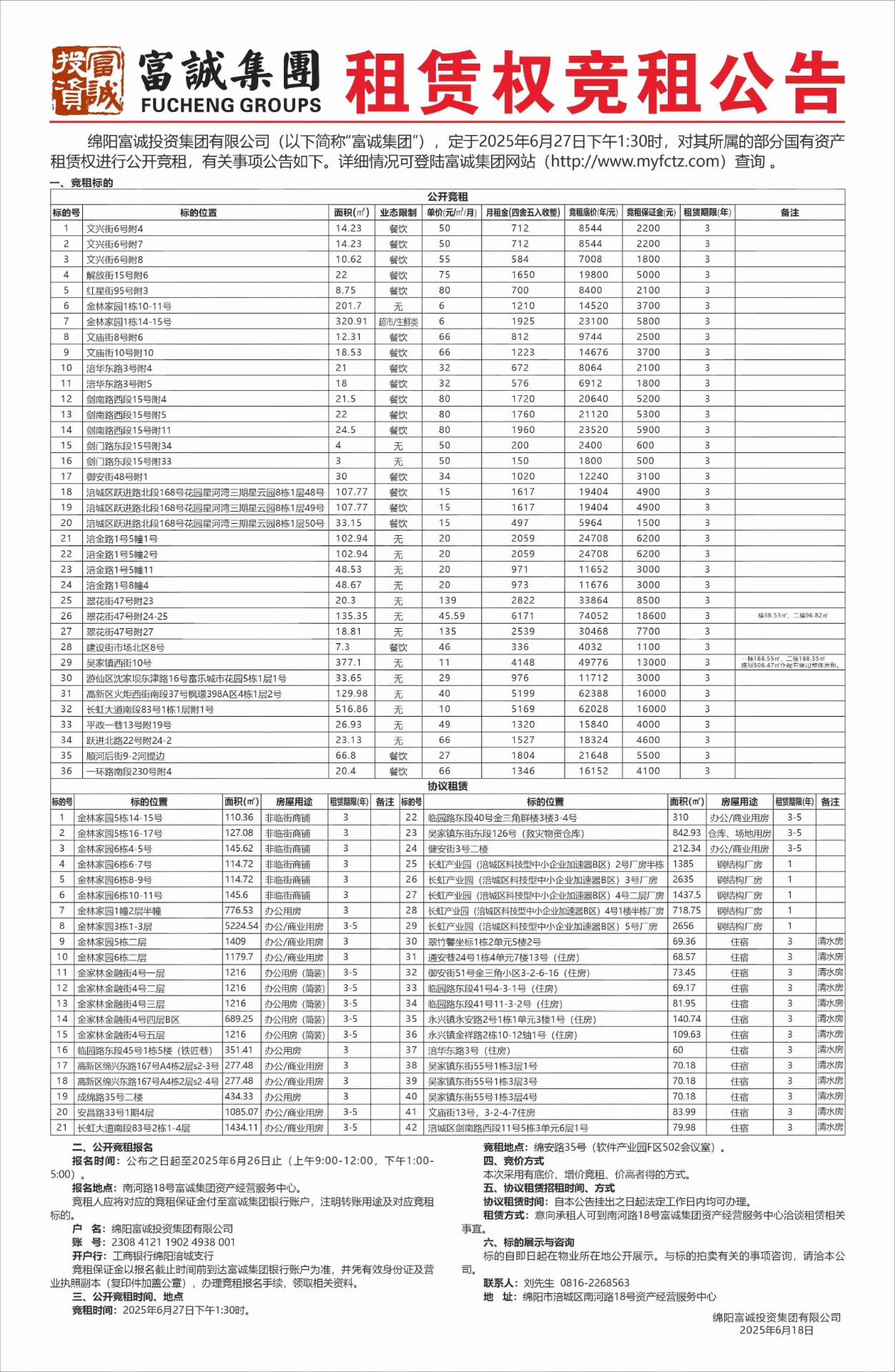 绵阳富城建筑工程有限公司本次需通过竞争性谈判公开招募产业配套用房人行通道改造项目施工方单位,此次报价采用竞争性谈判一轮总价报价方式进行谈判。控制价为15299.31元(不含税价),报价最低单位中标。报名时请提交以下材料:1、申请人有企业营业执照副本(三证合一)、具有相关资质复印件加盖鲜章,能提供增值税专用发票。2、法定代表人身份证:法定代表人亲自到场的出示身份证原件,存复印件。若法定代表人不能亲自到场的,被委托人应出具法定代表人授权委托书原件和被委托人的身份证(查验原件,存复印件加盖鲜章)。3、本项目不接受资格类型相同的供应商组成联合体参选。4、资质审查不合格者,不得参与下一程序的评选。5、上…… [更多]