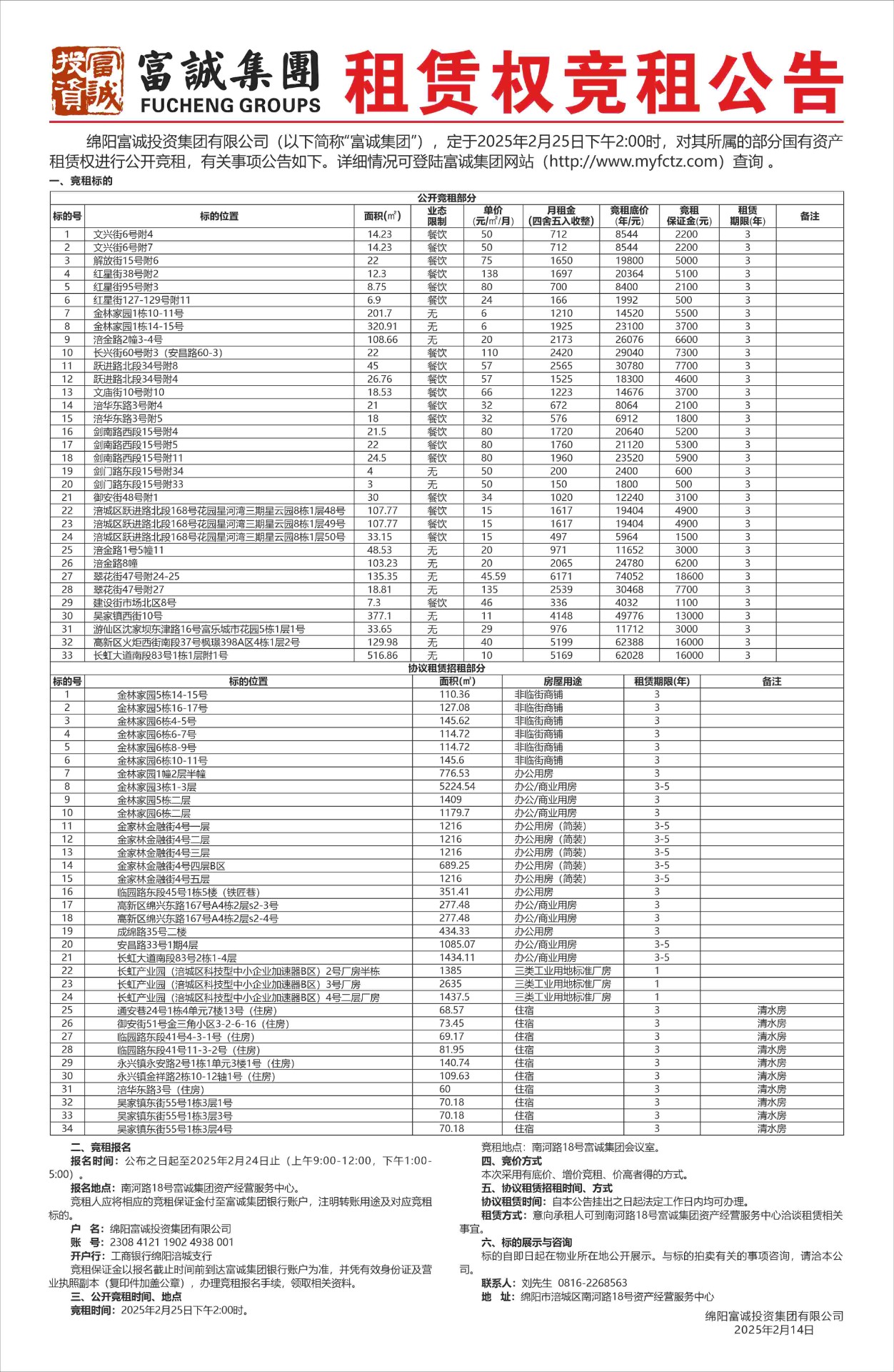 公 告 绵阳富城建筑工程有限公司本次需通过竞争性谈判公开招募企业资质延期服务单位,此次报价采用总价报价方式进行。报名时请提交以下材料:1.申请人有企业营业执照副本(三证合一)复印件加盖鲜章,能提供增值税专用发票。2.法定代表人身份证:法定代表人亲自到场的出示身份证原件,存复印件。若法定代表人不能亲自到场的,被委托人应出具法定代表人授权委托书原件和被委托人的身份证(查验原件,存加盖公司鲜章复印件。法定代表人范本见附件)。被委托人员须出具有效的本单位社保购买证明。3.本项目不接受资格类型相同的单位组成联合体参选。报名时间:202…… [更多]