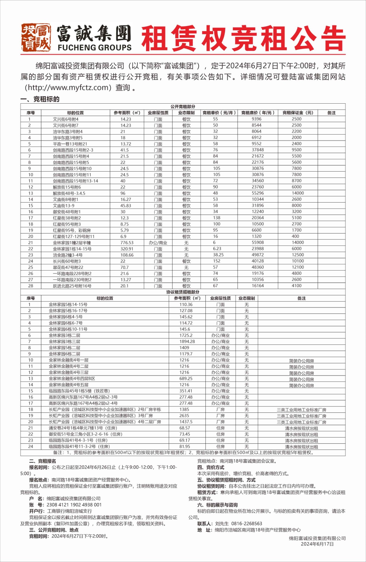 公 告 绵阳涪泽城市建设发展有限公司本次需通过竞争性谈判公开招募绵阳市涪城区石塘范家片区城中村改造项目(一期)可研代理招标单位,此次报价采用一次性报价下浮比例方式进行。报名时请提交以下材料:1、申请人有企业营业执照(相关经营范围),副本(三证合一)复印件加盖鲜章,能提供增值税专用发票。2、法定代表人身份证:法定代表人亲自到场的出示身份证原件,存复印件。若法定代表人不能亲自到场的,被委托人应出具法定代表人授权委托书原件和被委托人的身份证(查验原件,存加盖鲜章复印件)。3、本项目不接受联合体参选。4、资质审查不合格者,不得参与该…… [更多]