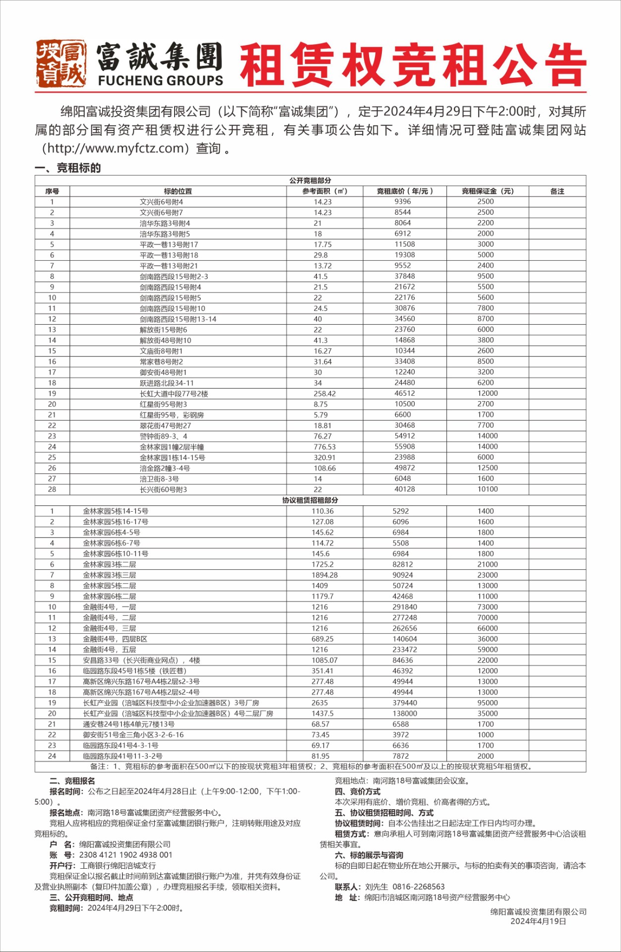 一、 项目基本情况1.项目业主单位:绵阳富辰物业管理有限公司。2.项目名称:采购物业服务。3.项目地址:绵阳市涪城区南河路18号。4.竞谈内容:绵阳富辰物业管理有限公司采购物业服务委托招标代理机构的确定。二、竞争性谈判申请人(简称申请人)必须具备的资格条件1.申请人执有效企业营业执照副本复印件(加盖鲜章),能提供增值税专用发票。2.申请人应具有在四川省政府采购网的网上备案截图(加盖鲜章)。3.法定代表人身份证:法定代表人亲自到场的出示身份证原件,存复印件。若法定代表人不能亲自到场的,被委托人应出具法定代表人授权委托书原件、身份证复印件和被委托人的身份证原件及复印件(均加盖公司鲜章)。…… [更多]