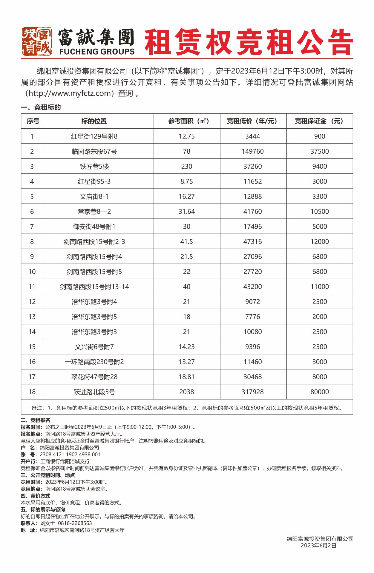 公 告 绵阳富城建筑工程有限公司本次需通过竞争性谈判公开招募绵阳市涪城区南片区道路基础设施建设提升工程(吴家至杨家段)竣工验收试验检测单位,此次报价采用竞争性谈判一次性报价方式进行。报名时请提交以下材料:1、申请人执有效企业营业执照副本复印件(加盖鲜章),能提供增值税专用发票。3、申请人具有计量认证证书以及公路工程综合乙级或以上检测资质(复印件加盖鲜章)。2、法定代表人身份证:法定代表人亲自到场的出示身份证原件,存复印件。若法定代表人不能亲自到场的,被委托人应出具法定代表人授权委托书原件、身份证复印件和被委托人的身份证原件及…… [更多]